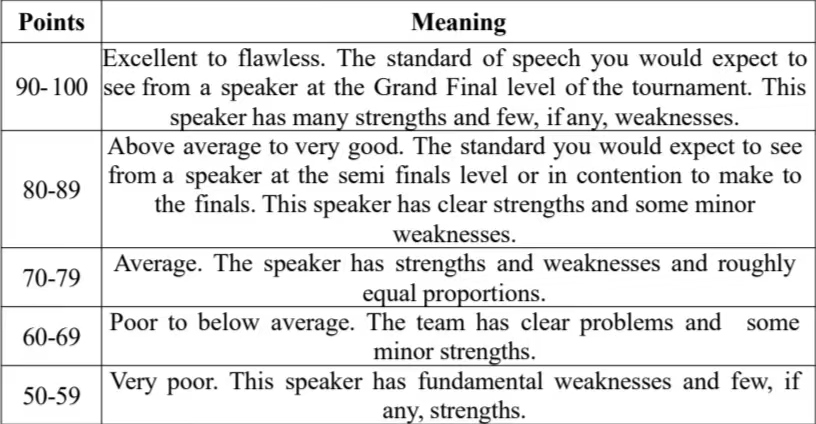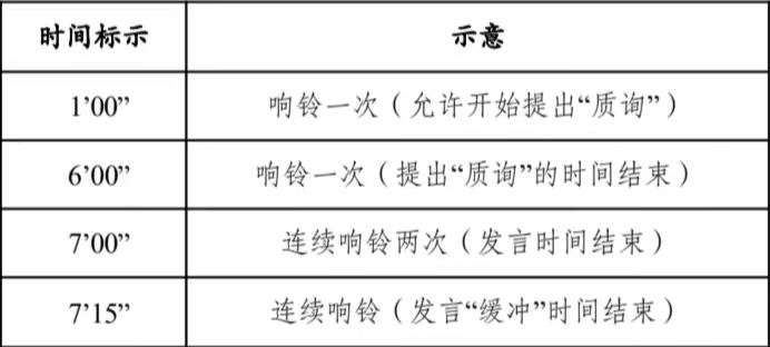 每位辩手的发言时间均为7分钟。辩手提出“质询”(POI)的时间应在发言人讲话的第2到第6分钟之间。发言计时从辩手开始说话为始,所有发言内容(包括致谢、开场白等)都在计时范围内。计时人员将在以下时间点向选手示意:时间标示 示意1’00” 响铃一次(允许开始提出“质询”)6’00” 响铃一次(提出“质询”的时间结束)7’00” 连续响铃两次(发言时间结束)7’15” 连续响铃(发言“缓冲”时间结束)在连续两次响铃结束后,辩手有15秒“缓冲”时间,在这段时间内允许选手进行总结。“缓冲”时间内不应提出新观点,且裁判可能会判此时间段内提出的新观点与论据为无效。在“ 缓冲”时间后仍继续发言的辩手将被裁判扣分。