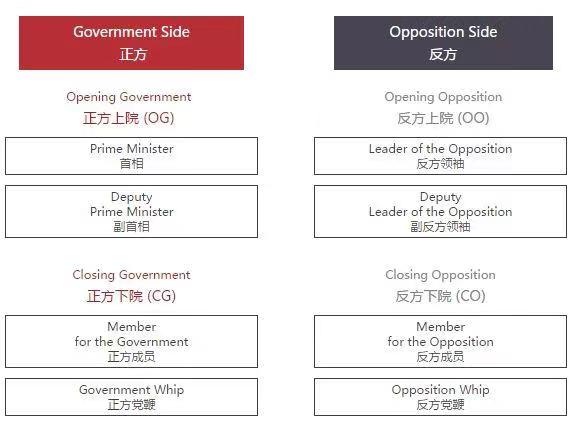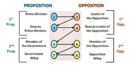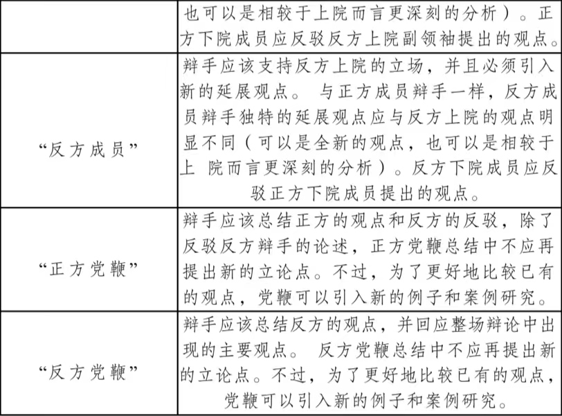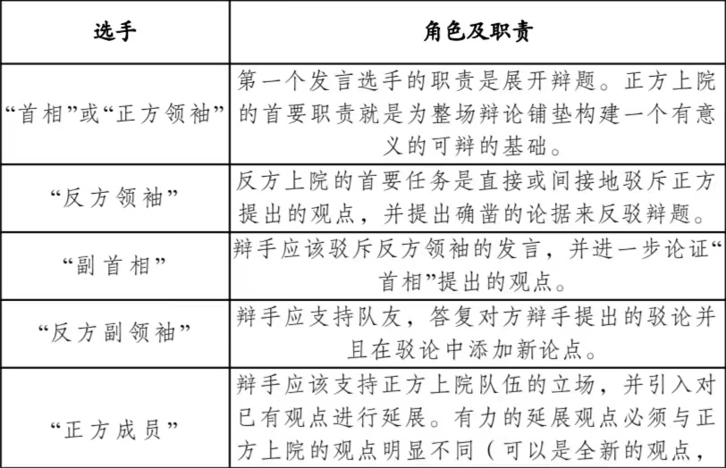 每个辩手都有特定角色且每段发言都须有明确具体的目的。下面列出的辩手角色及职责可提供借鉴,但比赛中的辩手角色既 不仅限于此,也并非皆须面面俱到。由于具体辩论情况不一,在正方支持辩题、反方驳斥辩题的前提下,辩手可能会完成设定角色以外的任务,其发言也可能不仅限于以下所列目的。除了两方最后一位辩手(正方和反方党鞭),其他所有辩手都应引入新的论据和材料(但并不须是新观点)。除了首相,所有辩手都应反驳对方辩手的观点。选手 角色及职责“首相”或“正方领袖” 第一个发言选手的职责是展开辩题。正方上院的首要职责就是为整场辩论铺垫构建一个有意义的可辩的基础。“反方领袖” 反方上院的首要任务是直接或间接地驳斥正方提出的观点,并提出确凿的论据来反驳辩题。“副首相”辩手应该驳斥反方领袖的发言,并进一步论证“ 首相”提出的观点。“反方副领袖” 辩手应支持队友,答复对方辩手提出的驳论并且在驳论中添加新论点。“正方成员” 辩手应该支持正方上院队伍的立场,并引入对已有观点进行延展。有力的延展观点必须与正方上院的观点明显不同(可以是全新的观点,也可以是相较于上院而言更深刻的分析)。正方下院成员应反驳反方上院副领袖提出的观点。“反方成员” 辩手应该支持反方上院的立场,并且必须引入新的延展观点。 与正方成员辩手一样,反方成员辩手独特的延展观点应与反方上院的观点明显不同(可以是全新的观点,也可以是相较于上院而言更深刻的分析)。反方下院成员应反驳正方下院成员提出的观点。“正方党鞭” 辩手应该总结正方的观点和反方的反驳,除了反驳反方辩手的论述,正方党鞭总结中不应再提出新的立论点。不过,为了更好地比较已有的观点,党鞭可以引入新的例子和案例研究。“反方党鞭” 辩手应该总结反方的观点,并回应整场辩论中出现的主要观点。 反方党鞭总结中不应再提出新的立论点。不过,为了更好地比较已有的观点,党鞭可以引入新的例子和案例研究。