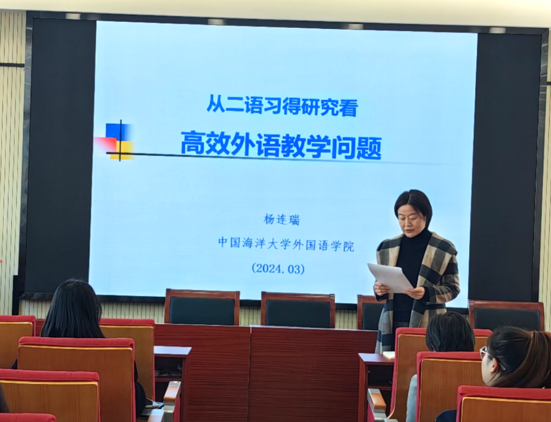 讲座伊始,李燕飞副经理对杨连瑞教授及本次讲座内容进行了介绍,并对杨教授的到来表示热烈欢迎。杨连瑞老师为中国海洋大学mk体育的教授、博士生导师,兼任中国英汉语比较研究会、二语习得专业研究委员会的会长。主要研究方向为二语习得和语言学。