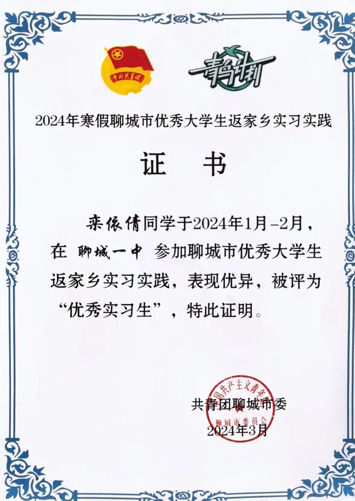 青春聚力,筑梦家乡。2024年1-2月,mk体育学子积极参与到“青鸟计划”返家乡实习实践中,为家乡发展做出贡献。2024年3月,共青团聊城市委对于参加聊城市优秀老员工返家乡实习实践的员工进行评选表彰,mk体育2023级英语本科生栾依倩获评聊城市“优秀实习生”。