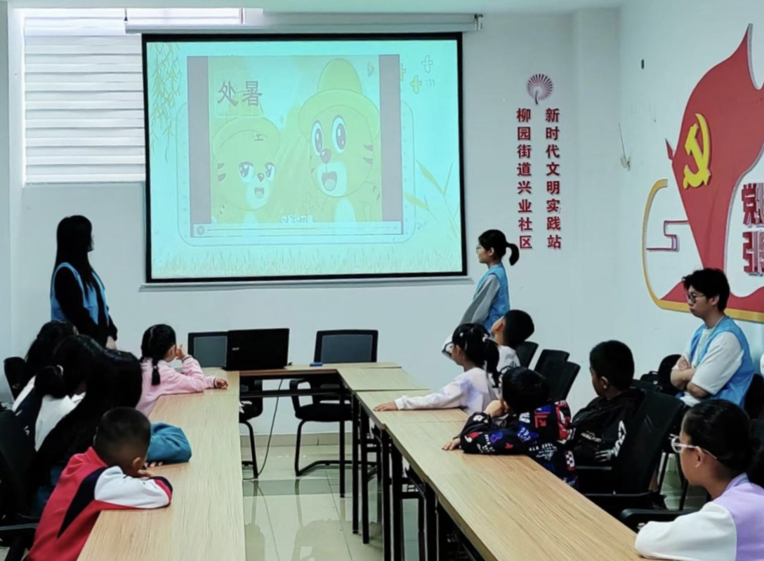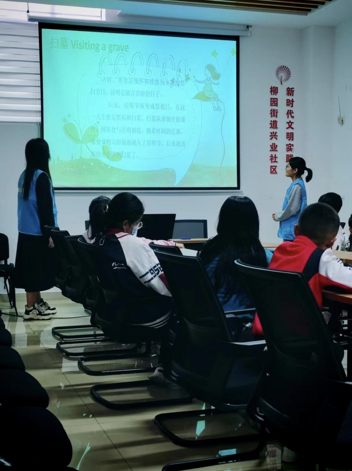 动准备阶段,志愿者分工协作,明确教学内容、教学主体,提前制作好需要用的课件。本次活动分为两部分,第一部分讲解“清明时节雨纷纷,路上行人欲断魂”的清明节气和“拨棹茶川去,初逢谷雨晴”的谷雨节气;第二部分讲解“却是石榴知立夏,年年此日一花开”的立夏节气和“久阴东虹断,小满北风寒”的小满节气。两位志愿者相互配合,耐心引导小朋友进入课堂,通过观看节气视频,共同学习节气知识,了解与该节气相关的习俗、传说,同时,穿插教授简单的英文词汇,拓展小朋友的课外知识。小朋友深深被教学内容吸引,听讲全神贯注,课堂气氛活跃。