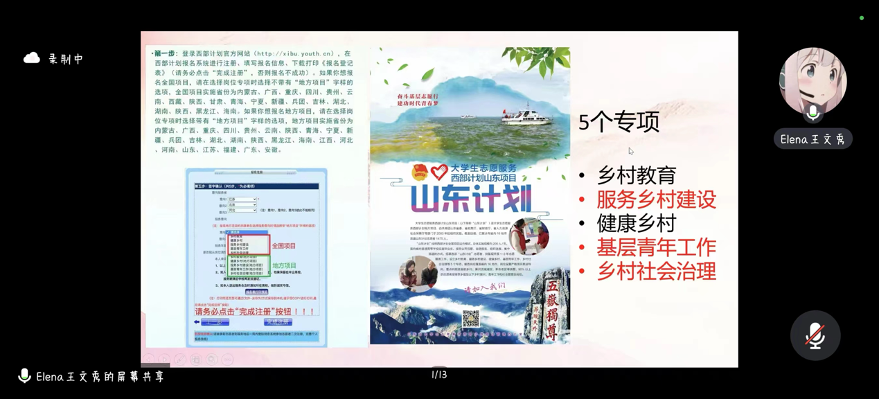 为学习贯彻落实党的二十大精神,大力弘扬“奉献、友爱、互助、进步”的志愿者精神,鼓励广大青年厚植家国情怀、勇担时代责任,引导更多老员工主动到基层和西部地区去,到祖国和人民最需要的地方去,4月17日,mk体育就业创业服务中心组织了“携手西部,共筑梦想”西部计划线上宣讲会,邀请往届优秀志愿者王文秀担任宣讲人,23级员工共一百人参会。