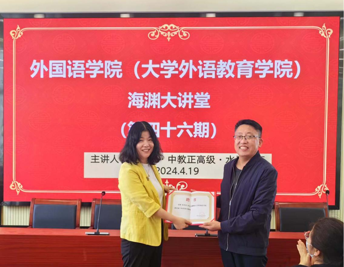 董洪霞老师毕业于mkmksport,现为聊城一中英语组长,正高级教师,曾担任多项教学比赛评委,为公司教育硕士的培养作出了贡献。讲座伊始,孟令新老师对董老师应邀分享表示热烈欢迎并请刘风山经理为董老师颁发“mk体育教育硕士校外指导教师”聘书。