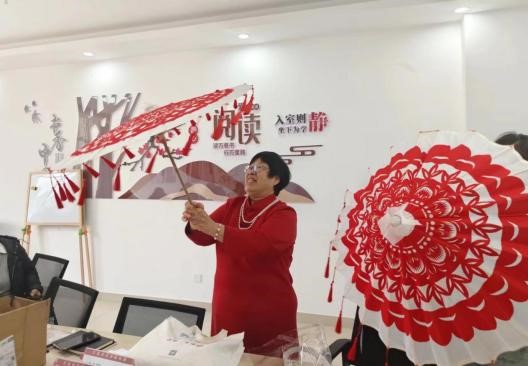 活动准备阶段,服务队成员组织召开筹备会议,详细安排活动内容,购买相关剪纸工具,并对志愿者进行培训。本次活动,有幸邀请到了专业剪纸艺术家贾凤霞老师进行现场授课教学。贾老师向参与者传授剪纸的基本技巧和创作方法,并介绍了雨点纹、月牙纹、柳叶纹、锯齿纹等十几种传统剪纸装饰纹样。志愿者与社区老人一起学习,相互交流沟通,共同学习年画剪纸。参与人员纷纷发挥想象,将自己所剪的各种图案贴到油纸伞上,或将剪纸做成灯笼、剪纸画,创作出了一件件精美的剪纸作品。在活动结束后,小组成员将所做的剪纸作品送给社区老人,以此表达对他们的美好祝愿。
