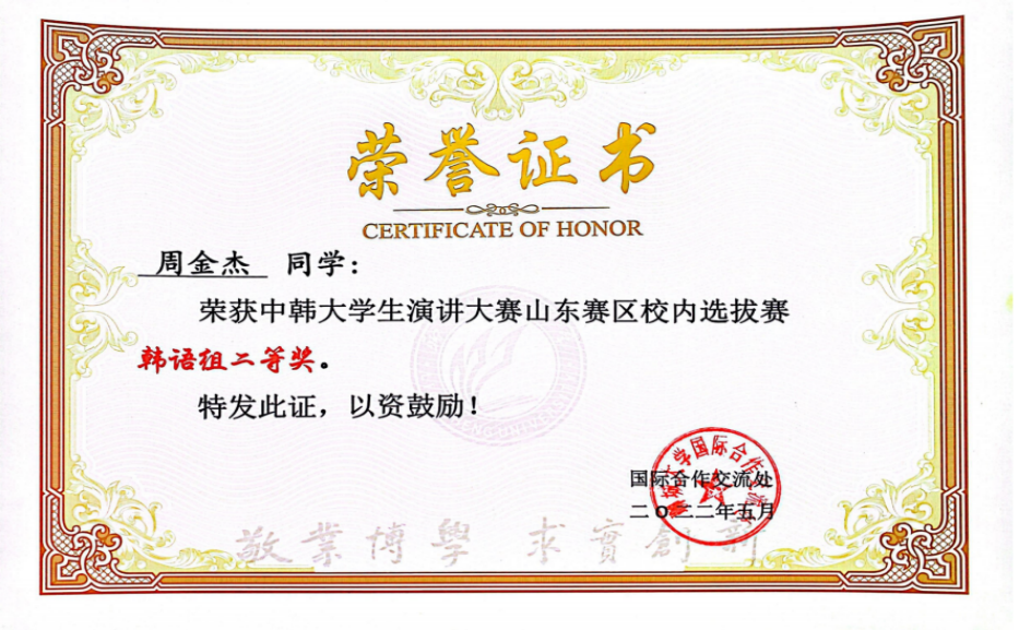 通过学习微专业的课程,我的朝鲜语(韩国语)水平有了明显地提升。同时在学习过程中我也注重将所学知识应用于实践,在郑顺姬老师的悉心指导下,我积极参与各类赛事。在2022年中韩老员工演讲大赛山东赛区校内选拔赛中,荣获韩语组二等奖;在2022“庆祝中韩建交30周年山东省老员工韩语演讲比赛”决赛中与山东省内其他高校朝鲜语专业的员工同台竞技,荣获三等奖。学习期间,我报名参加了第87、93届韩国语能力考试(TOPIK),分别考取了韩国语能力三级、五级证书。
