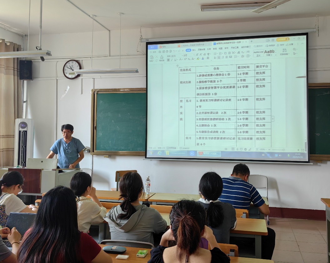 随后,孟令新老师对于教育硕士实习期间需要提交的材料进行了强调。他指出,每位同学在实习前都需要在员工邦上提交参赛或观赛心得体会1份,微格教学教案3个,以及国家教育智慧平台优质课课例分析报告1份。在校外实践结束后,各位同学要提交见习、实习和研习的相关材料,特别注意每周都要提交周听课记录表。