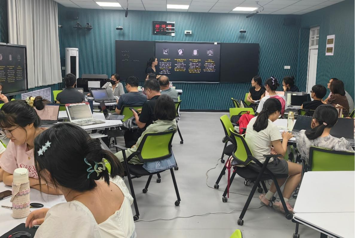 随后,石主任讲述了R,SPSS 和Python的区别以及R在各个领域的应用,并引导员工思考在研究中怎么使用R,给出以下答案:第一,在语言学相关研究中,可以使用R对词频进行统计。第二,可以使用R处理实验结果。最后,石主任以自己写的编码为例,带领在场师生练习了数据的运行,并进行有针对性地答疑。