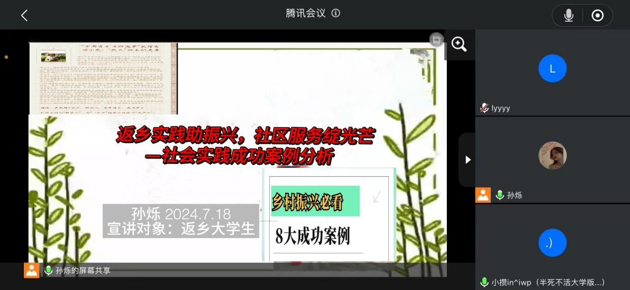 “心心向荣”服务队针对许多返乡老员工存在的问题,巧妙融合线上资源与线下调研,精心搜集并整理了多起返乡青年参与乡村振兴和社会服务的成功案例,策划了一系列线上研讨会,邀请各地老员工参会学习如何更好地开展社会实践。会上,队员们以生动的讲述和详实的资料,将乡村振兴的宏伟蓝图与社区服务的温馨实践紧密结合,向参会老员工讲述青年员工在社会实践领域的成功经验,为其提供多种社会实践的方式,帮助他们找到适合自己的志愿服务路径。与会员工反响热烈,他们纷纷表示此次活动拓宽了自身的视野。在会议的启发下,他们表示愿意利用假期深入社区、积极参与挂职锻炼,将所学的知识运用到实际工作中。