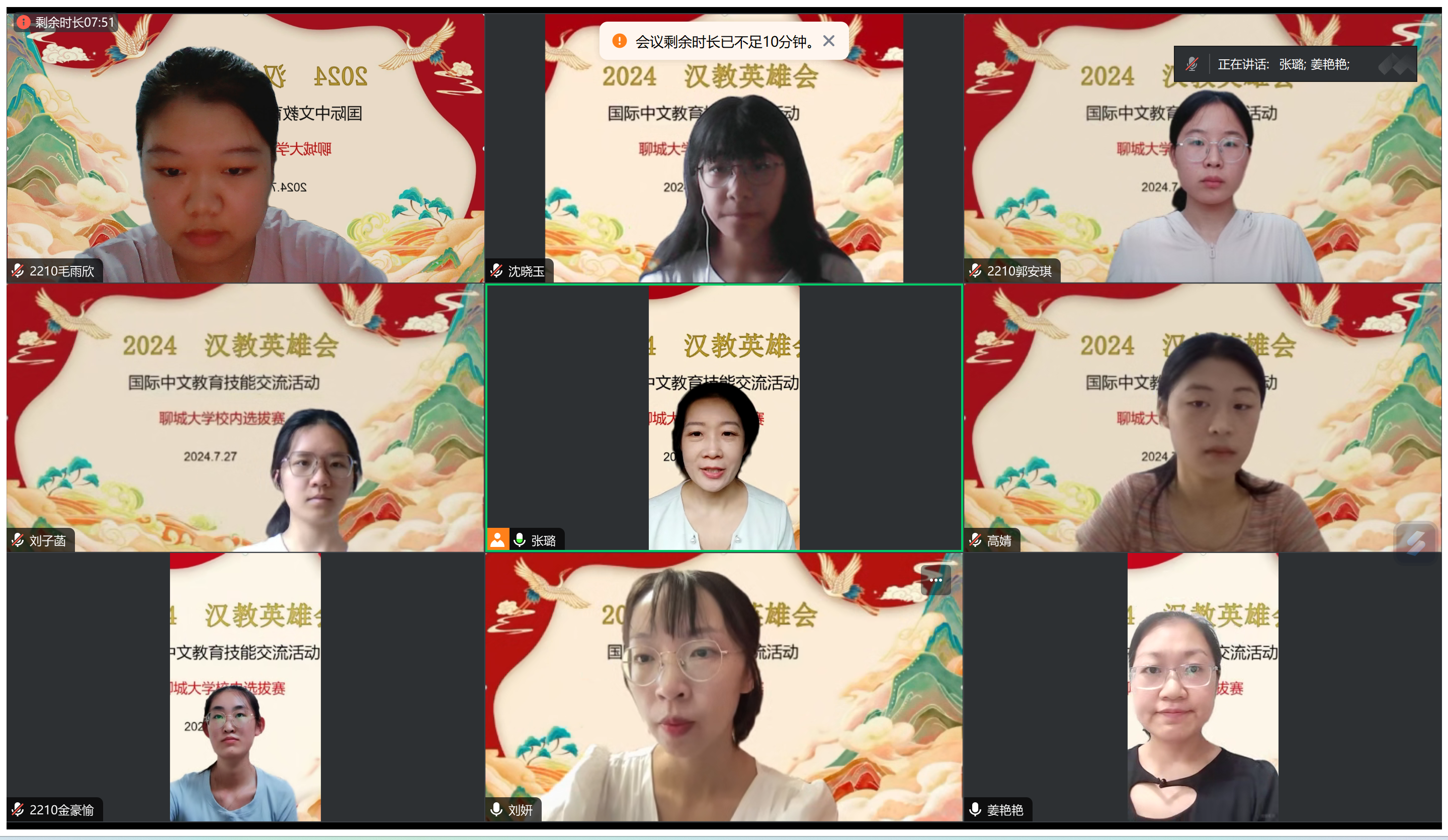 7月27日,mk体育汉语国际教育系于线上成功举办2024年“汉教英雄会”国际中文技能教学交流活动校内选拔赛。“汉教英雄会”由教育部中外语言交流合作中心、全国汉语国际教育专业学位研究生教育指导委员会主办,是全球国际中文教育师生开拓视野、交流学习的创新平台,已成为国际中文教育领域的一个响亮品牌。汉教系主任姜艳艳老师、副主任张璐老师以及刘妍老师出席本次比赛。