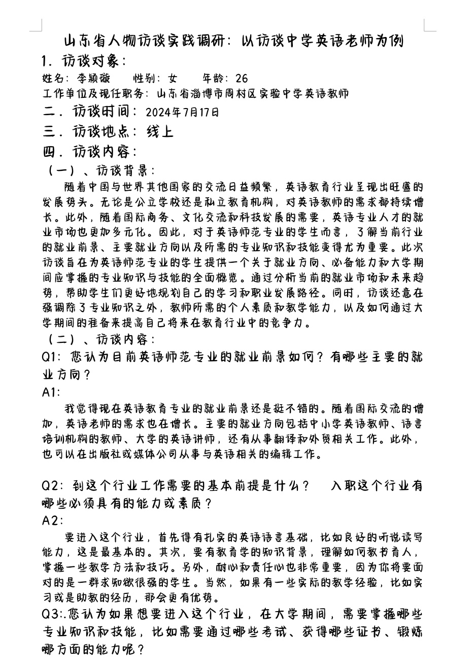 本次活动,扬帆起航服务队采访了山东省淄博市周村区实验中学英语教师李颖璇女士。在访谈中,李颖璇表示,随着国际交流的增加英语教育专业的就业前景十分广阔,英语教师的需求也在不断增长,她向实践队成员分享了除中小学教师职业以外其他职业,她表示英语专业毕业生还可以涉猎语言培训机构、翻译和外贸相关工作,或者在出版社或媒体公司从事与英语相关的编辑工作。李颖璇教师还向大家分享了学习经验,她表示在大学期间,英专生应该专注提升自己的英语水平,考取教团队格证。同时,英专生应学习心理学和教育学从而提升教学和班级管理技能。她表示这些技能不仅能帮助员工提高自身的英语水平,还能增强其教学和班级管理能力,为将来的教育工作打下坚实的基础。