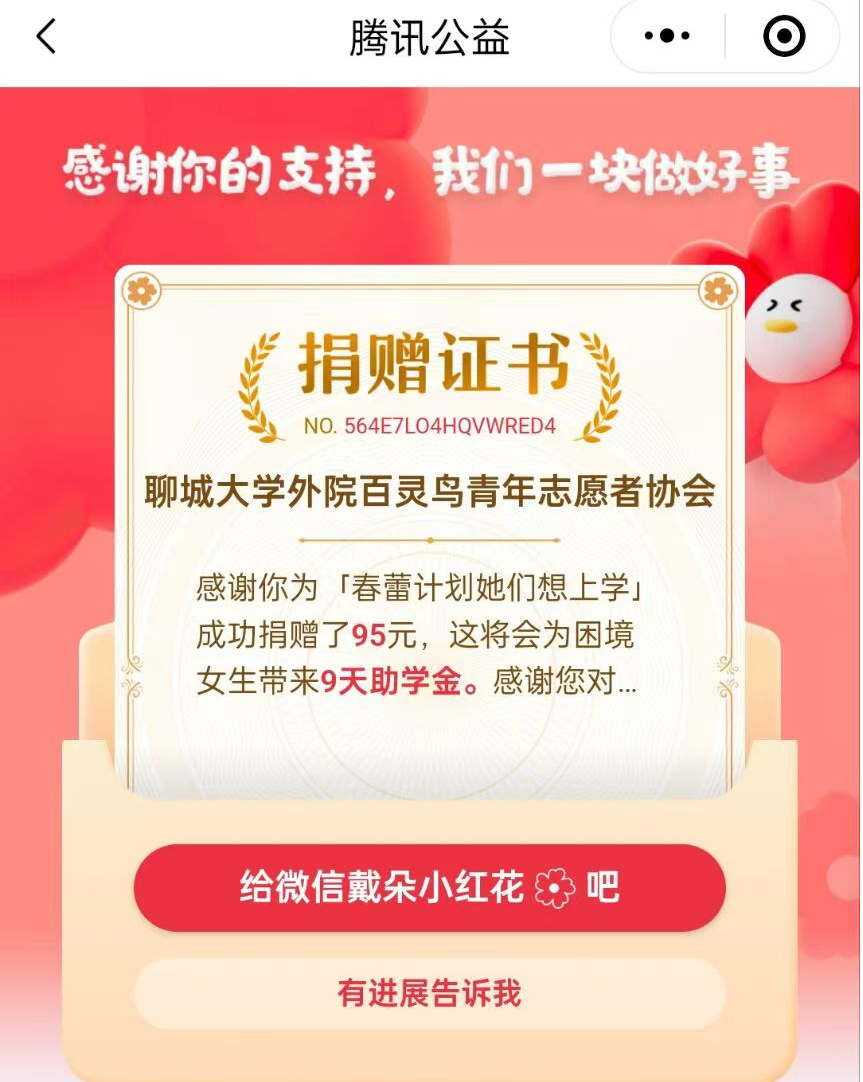 活动结束后,志愿者们整理好剩余物品并将其妥善放置,后将爱心金钱悉数捐献到由腾讯公益开展的“春蕾计划”中。这笔善款将成为那些家庭经济困难的女生的部分学费,帮助她们继续接受教育,追逐梦想。