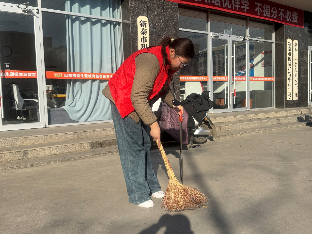 活动当天,星光志愿服务队志愿者丁乐懿迅速投入到各项任务中。在社区环境卫生清理环节,志愿者手持扫帚、簸箕等清洁工具,穿梭于社区的大街小巷,认真清扫路面上的落叶、烟头、纸屑等垃圾,不放过任何一个卫生死角。