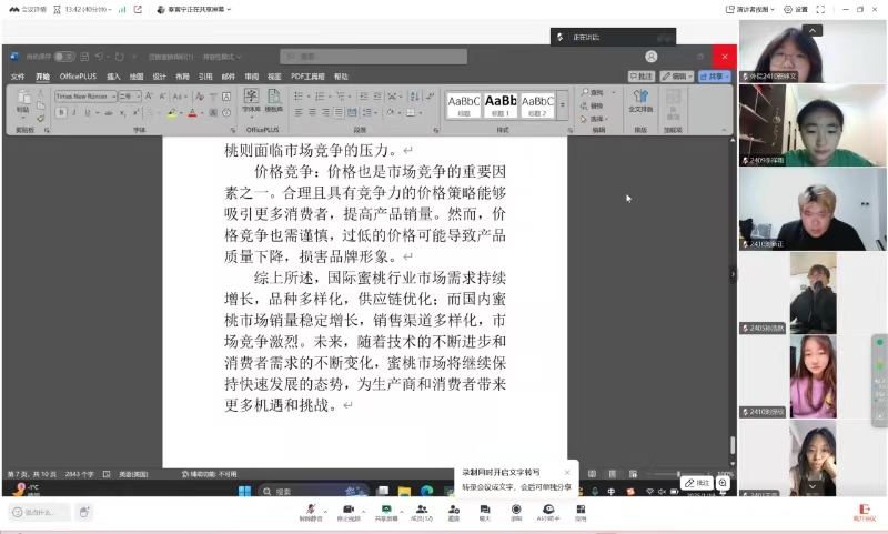 实践汇报时,成员分享通过线上问卷调研、大数据分析收集的信息,从SWOT、国际和国内销售三方面剖析岱崮蜜桃产业,深入探讨了产业的优势、劣势、机会和威胁,以及国内外销售现状,与会成员据此展开热烈讨论并提出针对性建议。