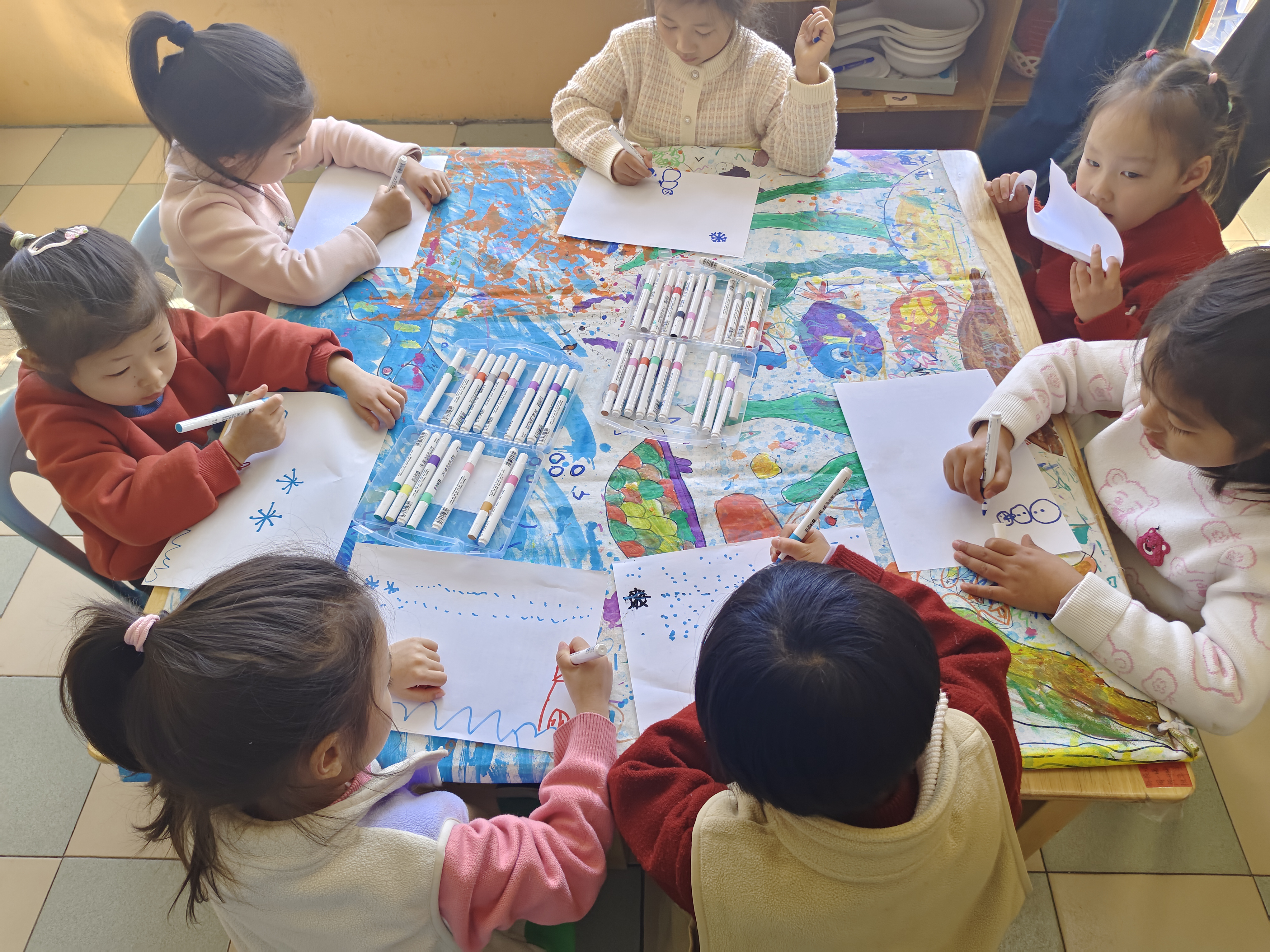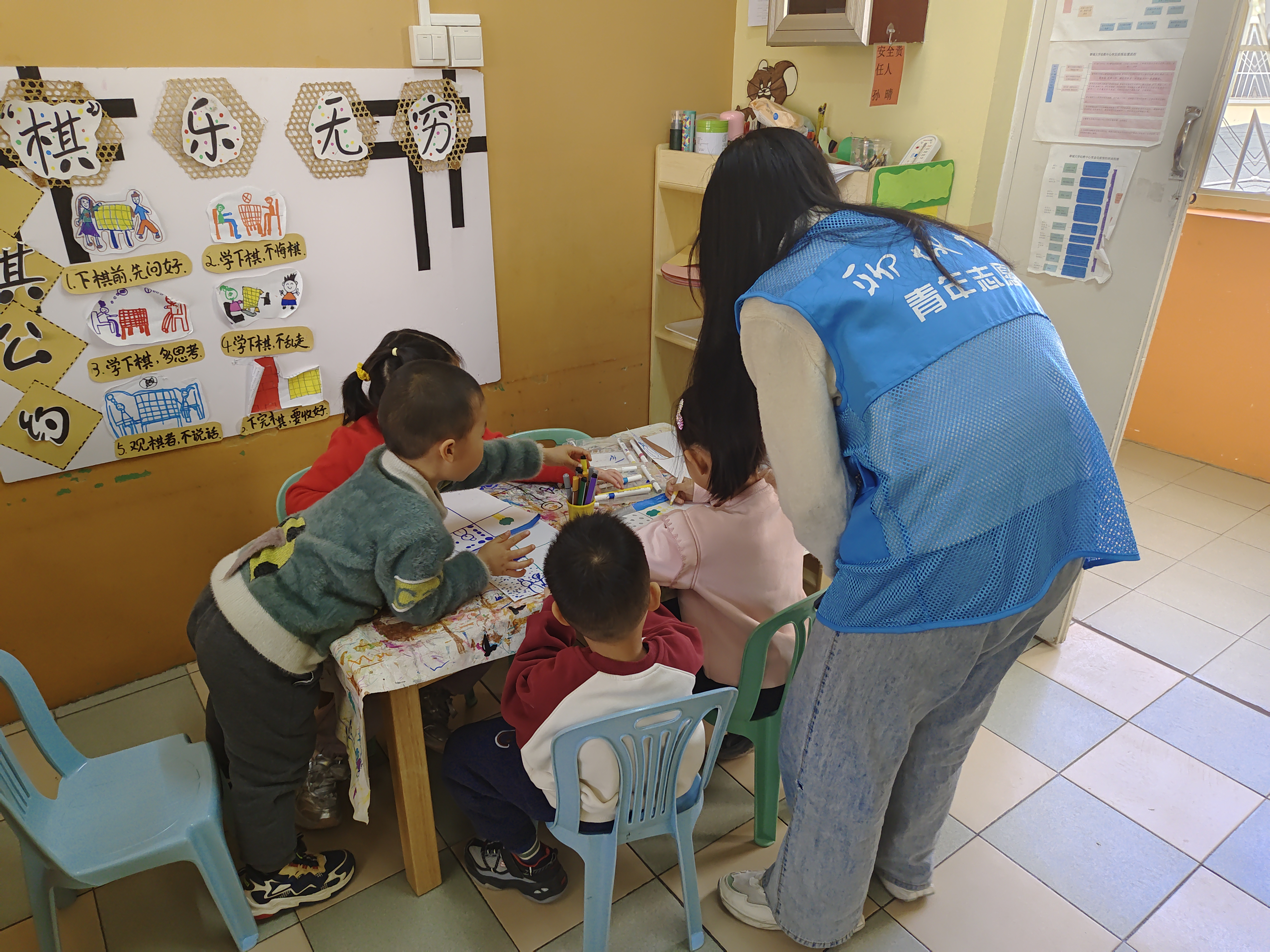 最后的画画环节将活动推向高潮,志愿者组织小朋友画出了他们最喜欢的季节。小朋友拿起画笔,用五彩斑斓的颜色描绘出心中的四季。志愿者们则穿梭其中,耐心指导,与小朋友亲切交流。