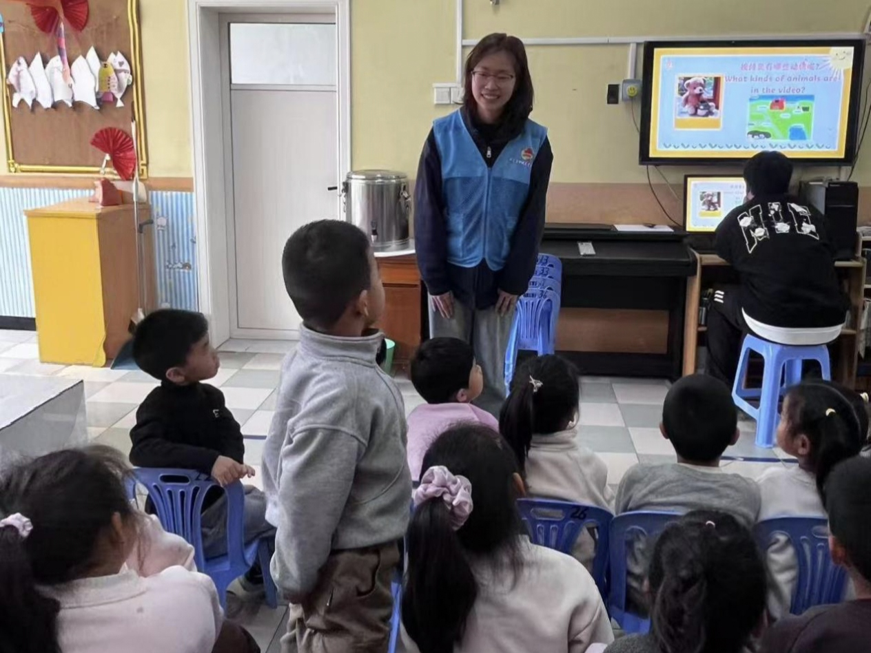 活动在欢快的英语儿歌教唱中拉开帷幕。志愿者用亲切甜美的歌声和富有感染力的动作,带领小朋友唱起了《Twinkle, Twinkle, Little Star》《Row, Row, Row Your Boat》等经典的英语儿歌。趣味单词教学环节将活动推向了高潮,志愿者精心准备了色彩鲜艳的单词卡片和各种实物道具,通过生动形象地展示和有趣的互动,教授小朋友水果、动物、日常用品等常见单词。为了让小朋友在实际情境中运用英语,活动还设置了简单对话情景模拟环节,“购物”“打招呼”等贴近生活的情景让小朋友迅速投入其中。
