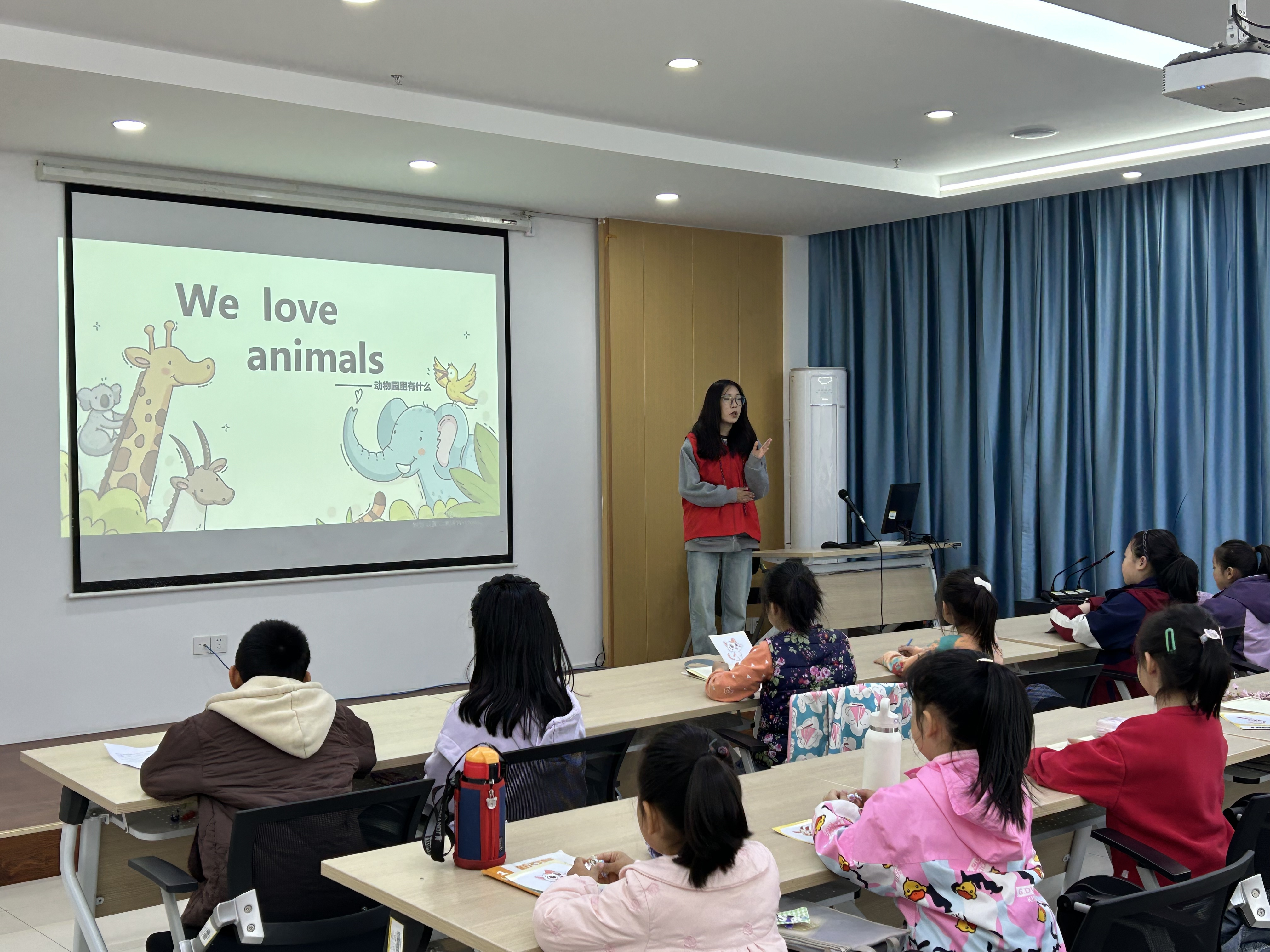 活动伊始,志愿者团队通过播放自然拼读字母歌等趣味英文动画,迅速为现场营造出轻松愉悦的学习氛围。随后,他们运用色彩鲜艳的单词卡片配合生动的肢体语言,将新单词与短句教学转化为互动游戏。这种沉浸式的教学方式极大地激发了孩子们的参与热情。