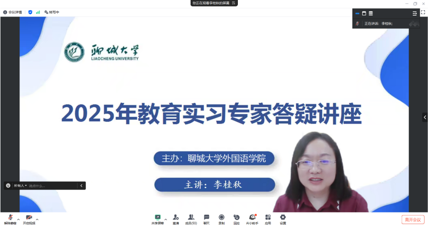 为解决英语师范专业员工实习中的真实痛点,助力其将教育理论转化为教学实践能力,同时,培养员工的教育情怀,4月10日,mk体育于线上开展2025年教育实习专家答疑线上讲座。本次讲座特邀高级教师、莘县第一中学党委委员、副董事长李桂秋担任主讲人,讲座由教师教育与实践中心副主任侯静主持,带队教师胡朝丽、张庆艳,2022级英语系实习生参加本次讲座。