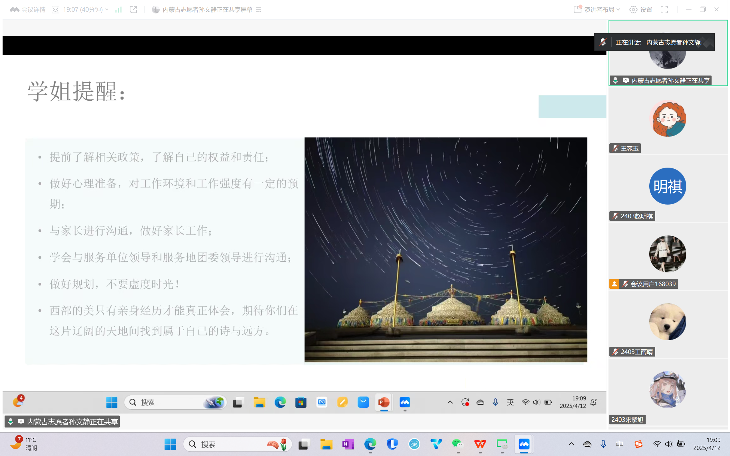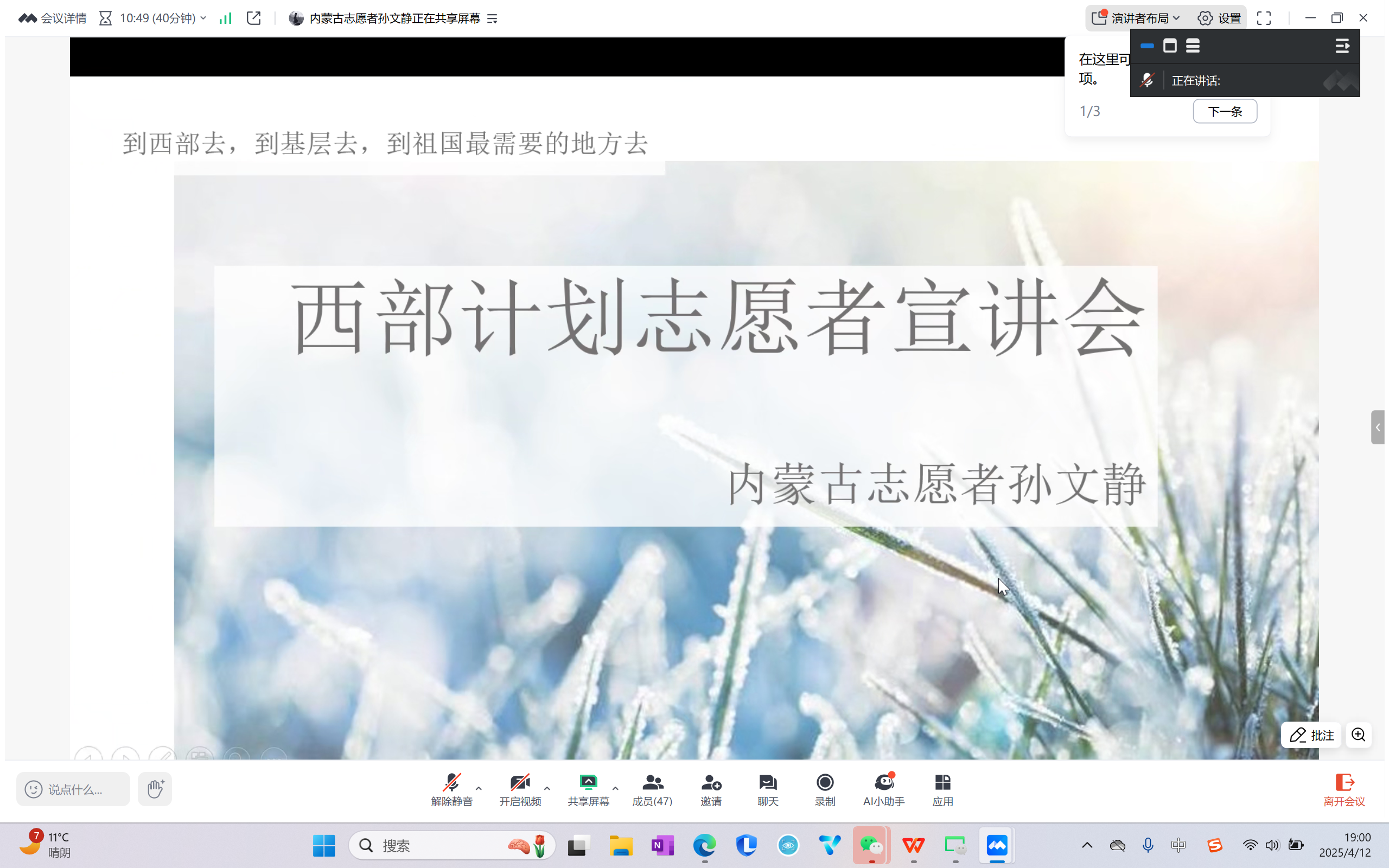 为鼓励青年学子响应国家号召,投身西部建设,在奉献中实现个人价值与社会价值的统一,4月12日,mk体育精心组织开展了第三期西部计划宣讲会。本次宣讲会由2024年西部计划志愿者孙文静担任主讲人,以线上形式展开,mk体育员工积极参加。