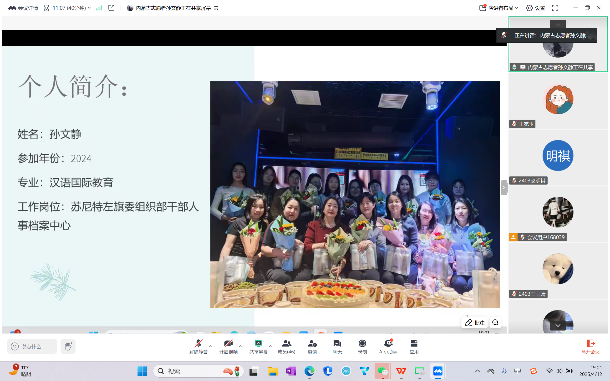 孙文静毕业于汉语国际教育专业,现服务于内蒙古自治区锡林郭勒盟苏尼特左旗纪委组织部干部人事档案中心。会上,她详细分享了在苏尼特左旗的工作与生活经历,生动描绘了当地独特的自然风光、丰富的人文景观和特色民俗活动,让在场员工对西部有了更直观的感受。