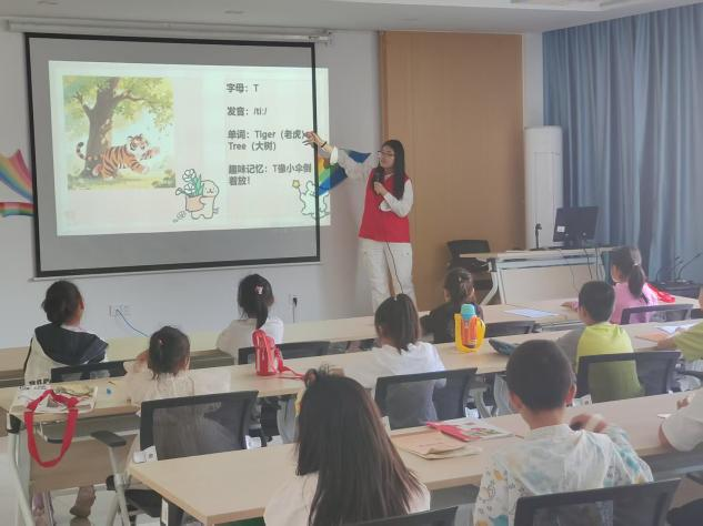 活动伊始,志愿者们播放了生动有趣的英语字母动画短片。灵动的画面、活泼的音效瞬间吸引了小朋友们的目光,志愿者借此带领大家认识新的英文字母。随后,志愿者拿出色彩鲜艳的单词卡片,围绕水果、动物等与日常生活息息相关的主题,耐心教授单词。课堂上,小朋友们全神贯注,踊跃跟读,学习氛围十分热烈。