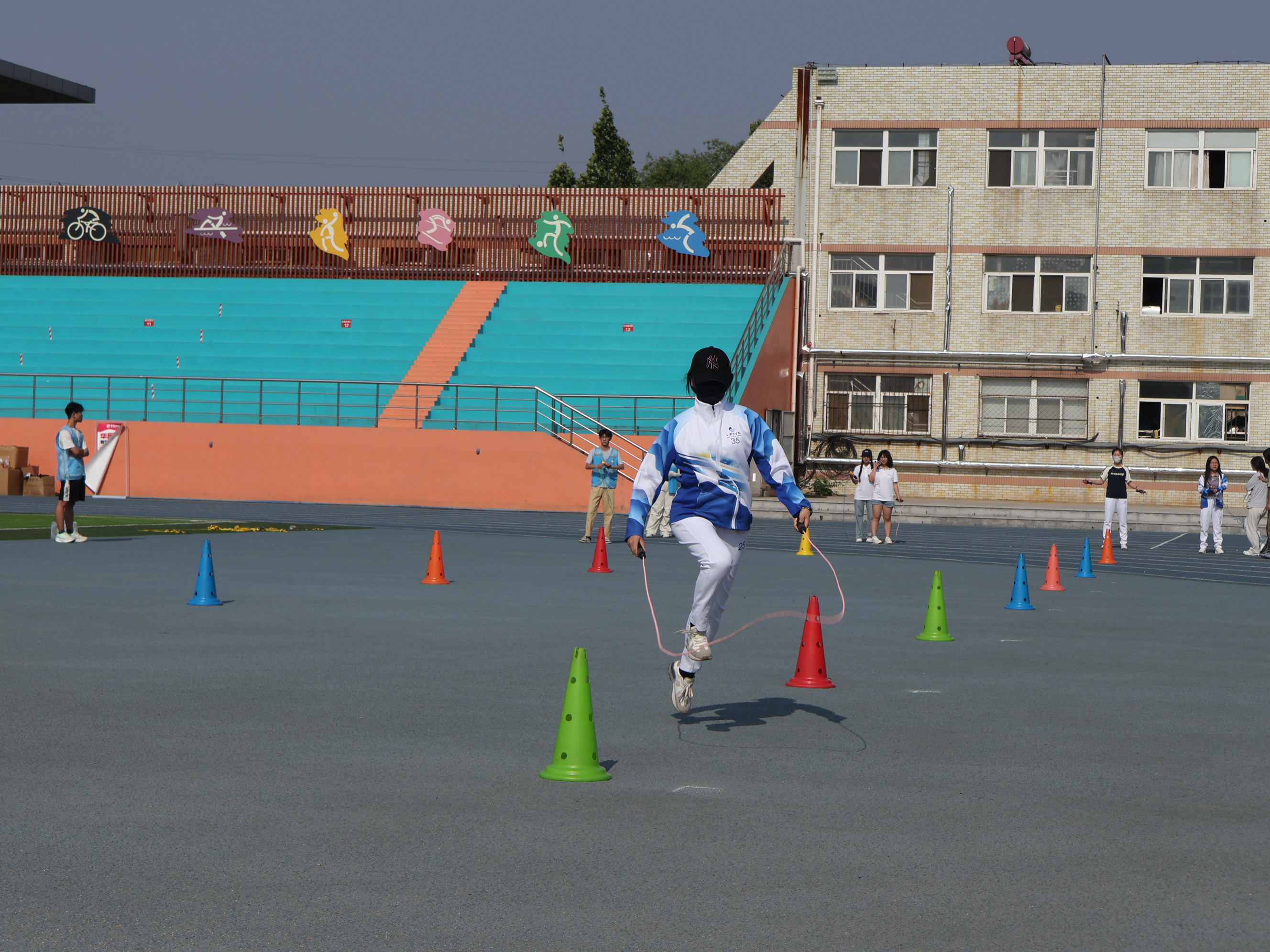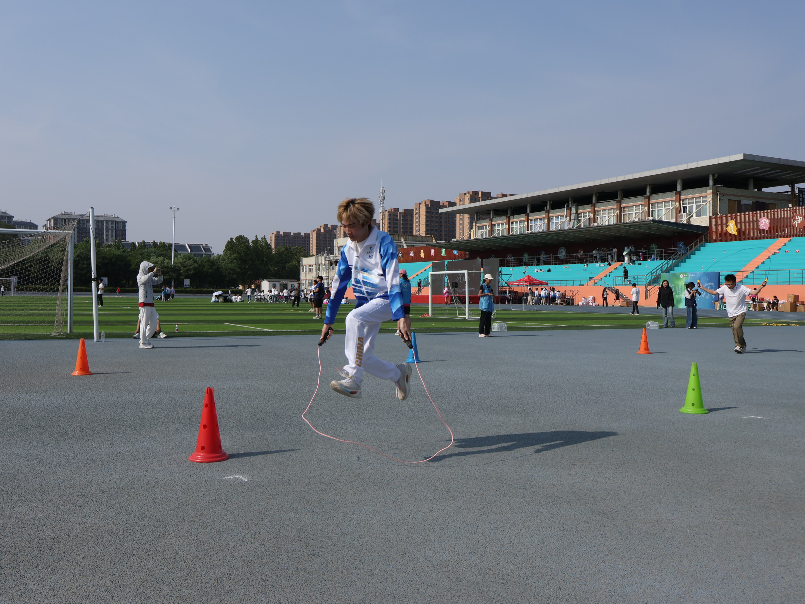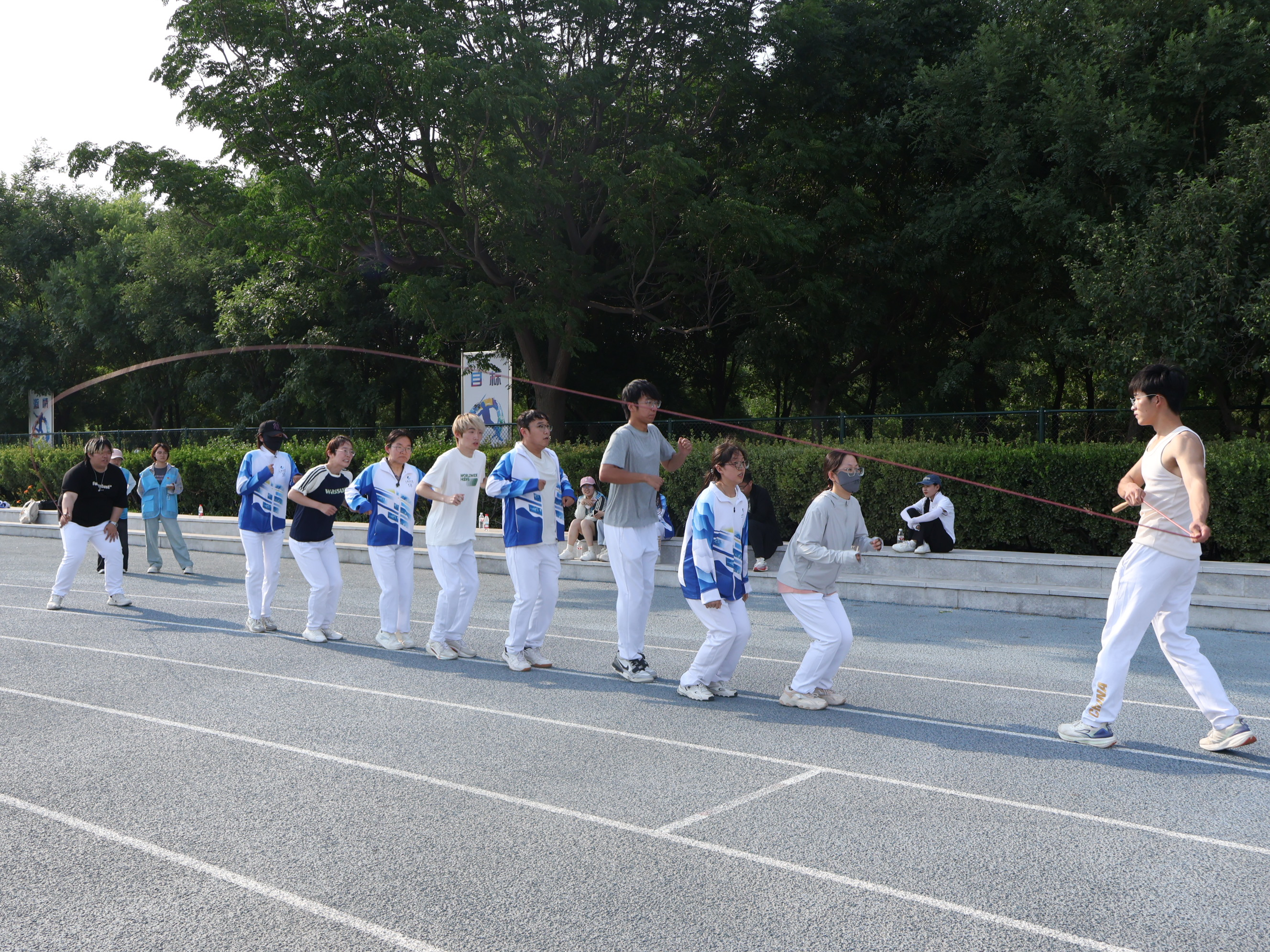 “跃动时光,‘绳’采飞扬”赛场上,彩绳翻飞如虹,十人团队节奏博弈——抡绳者臂膀发力,跳绳者轻盈跃动,力争20次连贯跳跃。绳影起落间,默契随汗水攀升,青春风采在腾跃中绽放。