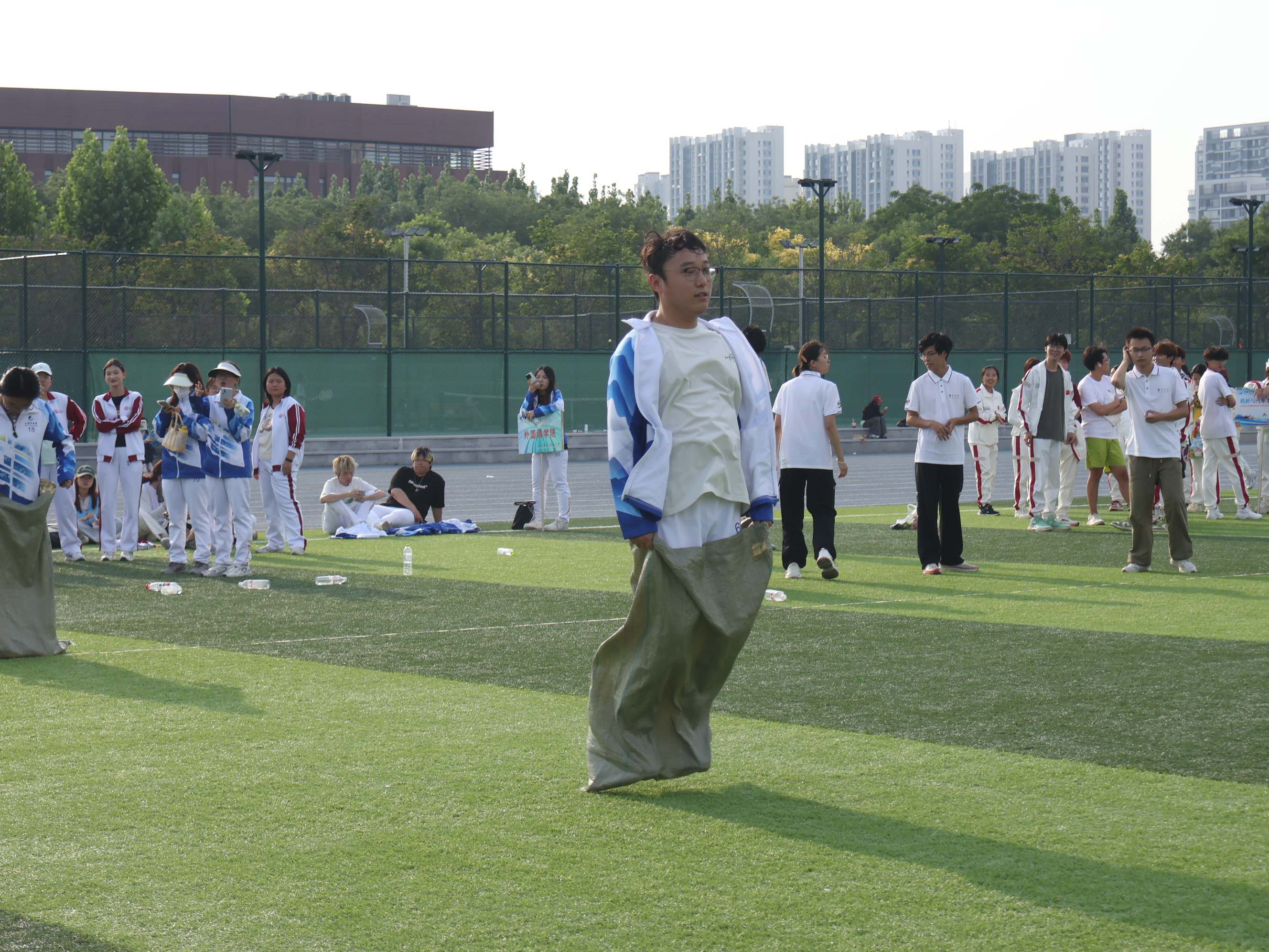 “兔子跑步”赛场上,选手们套上麻袋蹦跳前行、你追我赶,以活泼姿态展现青春风采。