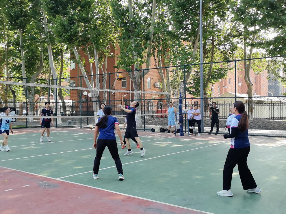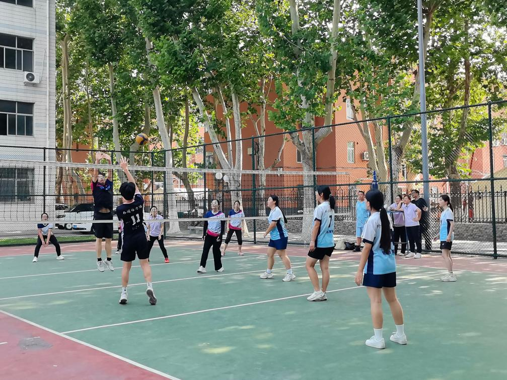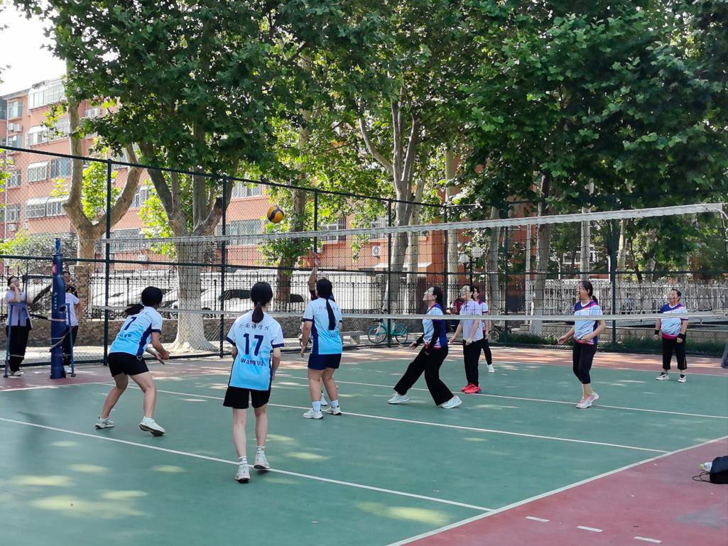 比赛当日,阳光明媚,排球场气氛热烈。参赛师生们早早来到场地进行热身。参赛选手们精神抖擞,早早来到场地进行热身活动。