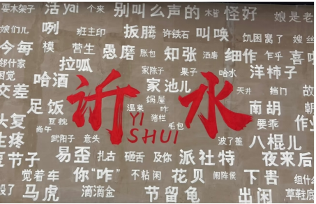 调研过程中,团队成员还发现了一面沂水方言墙,记录了沂水当地独具特色的方言词汇。文化墙长约8米,以当地青石为底,用白色油漆手书“波拉盖(膝盖)”“夜来(昨天)”“家池儿(麻雀)”等50余个沂水方言词汇,每个词语都生动诠释着地域文化的内涵。