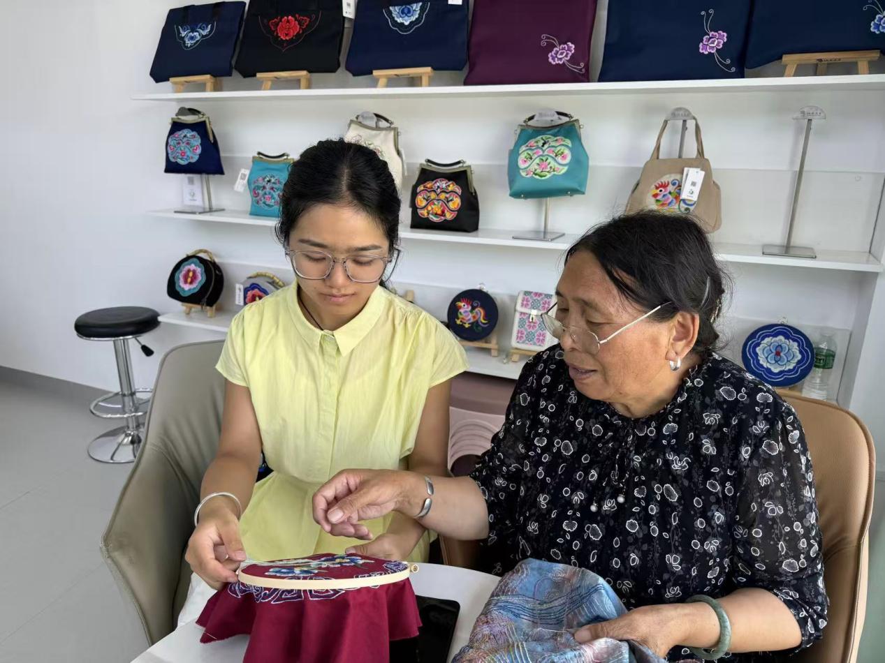 活动伊始,队员们来到社区的手工艺工作室。在这里,老人们热情地向她们展示传统手工艺。一位老人耐心地指导队员们穿针引线、绣制图案,队员们认真学习,在一来一往的交流中,不仅学到了传统技艺,更与老人建立起亲密的联系。老人们脸上洋溢着笑容,分享着自己多年来的刺绣心得和背后的故事,让实践队队员们深刻感受到传统手工艺承载的情感与文化价值。