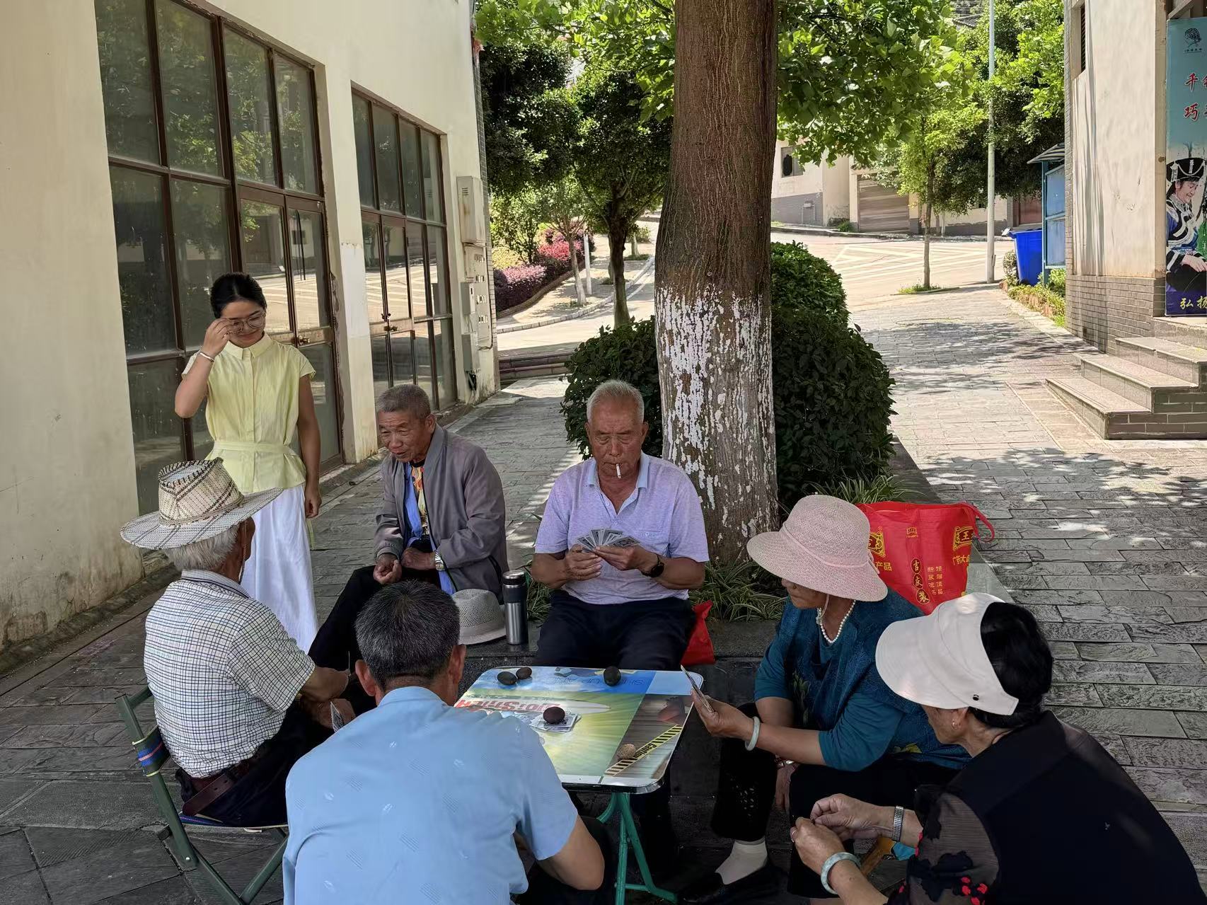 随后,“石榴籽”实践队队员与老人一同来到社区的大树下,这里是老人们日常休闲娱乐的聚集地。众人围坐在一起,有的老人正专注地打着扑克牌,“石榴籽”实践队队员站在一旁观看,适时与老人交流互动,气氛轻松愉快。在交流过程中,“石榴籽”实践队队员倾听老人们的生活琐事、人生经历和内心想法,了解到他们在日常生活中的孤独与对陪伴的渴望。同时,“石榴籽”实践队队员也向老人们分享自己的校园生活、新鲜见闻,为他们的生活带来新的活力与趣味。
