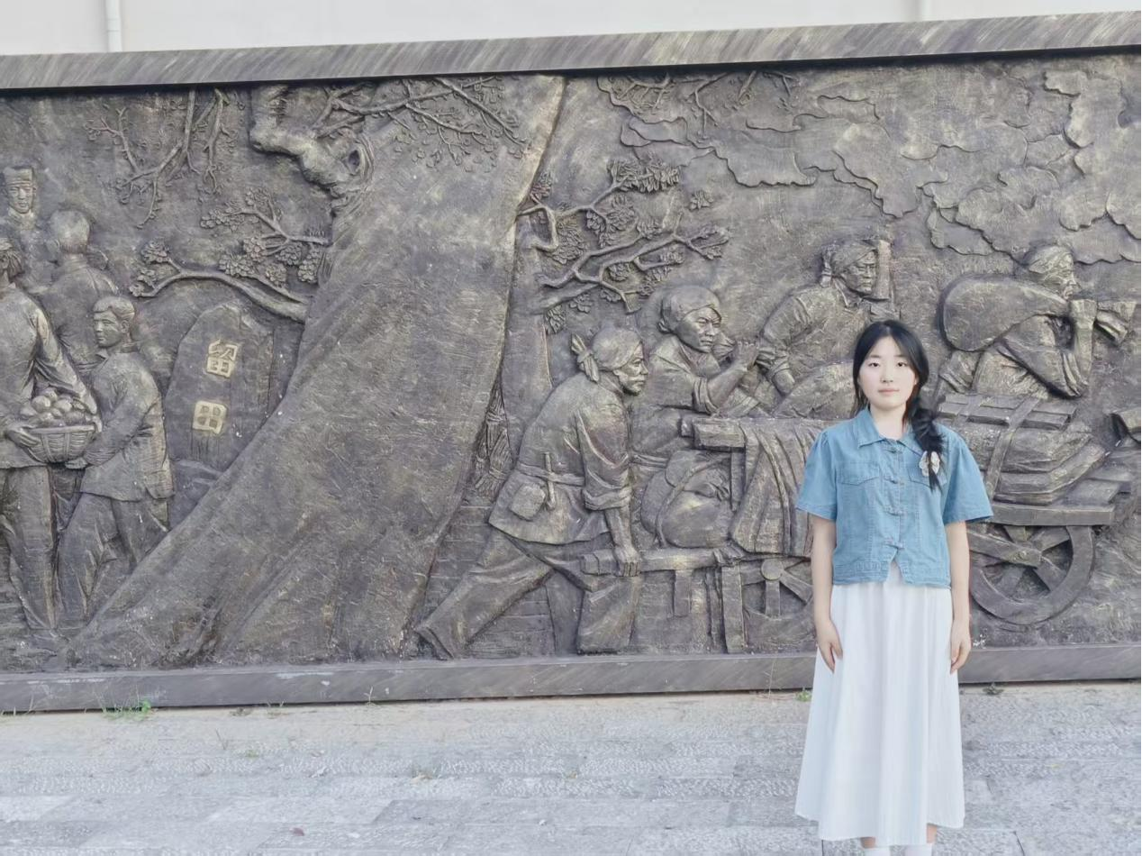 抵达留田抗战遗址后,队员们首先来到“革命战争时代”主题雕塑群前。雕塑生动展现革命战士冲锋陷阵的姿态,实践队队员们驻足凝视,聆听领队讲述当年抗战故事,深刻体会战争的残酷与革命先辈的英勇无畏。随后,队员们有序参观“一一五师司令部旧址” ,旧居内陈列的历史物件、珍贵史料,无声诉说着往昔峥嵘岁月。在留田抗战主题浮雕墙前,队员们认真观看浮雕上刻画的军民抗战场景,交流讨论历史细节,沉浸式感受革命时期军民同心、共御外敌的坚定信念。