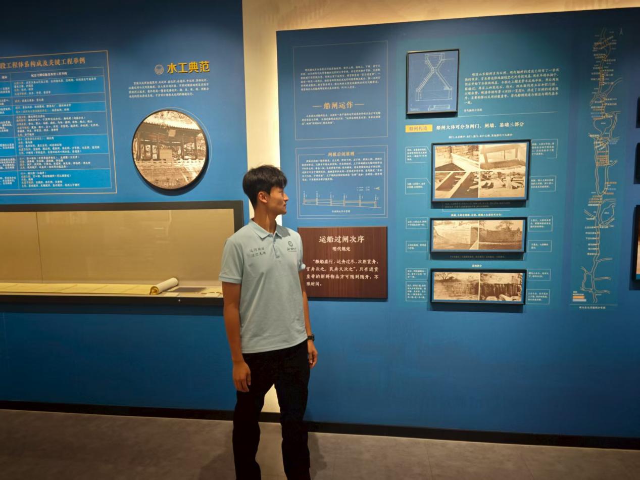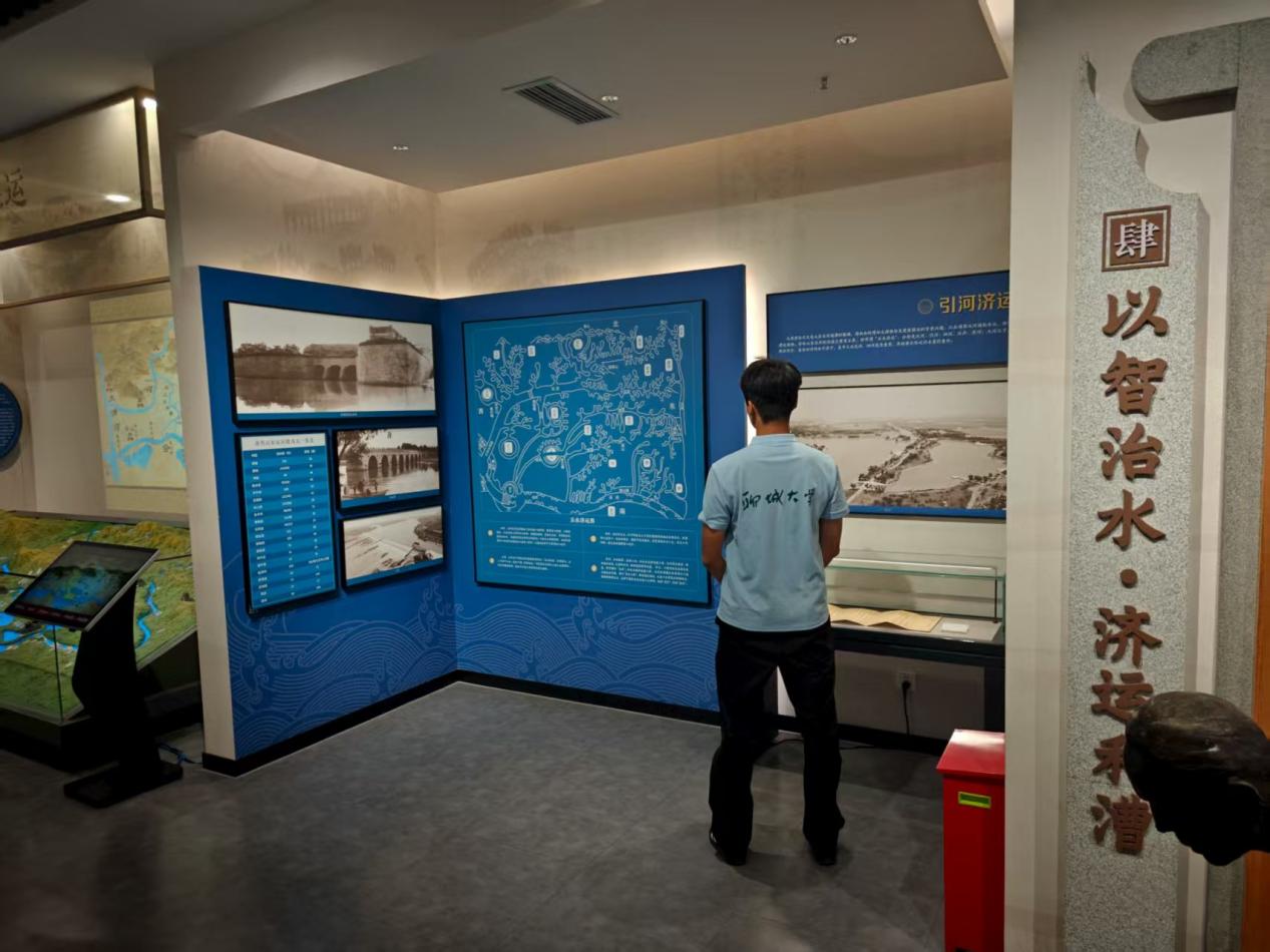 步入下一板块,队员们专注凝视着治水济运展板,那里藏着治水济运的古老智慧:引河济运的谋略、船闸运作的巧思,在图文间缓缓流淌。那些斑驳史料,诉说着先辈驭水护漕的坚韧,使队员们读懂了运河承载的兴衰与使命。触摸展柜里的古物,仿佛接通时空专线,和古人对话治水智慧。一团队成员感慨道:“这一趟,不仅是参观,更是一场与历史的深度共鸣,激励我们传承水利精神,在新时代讲好运河故事,续写护水新篇。”