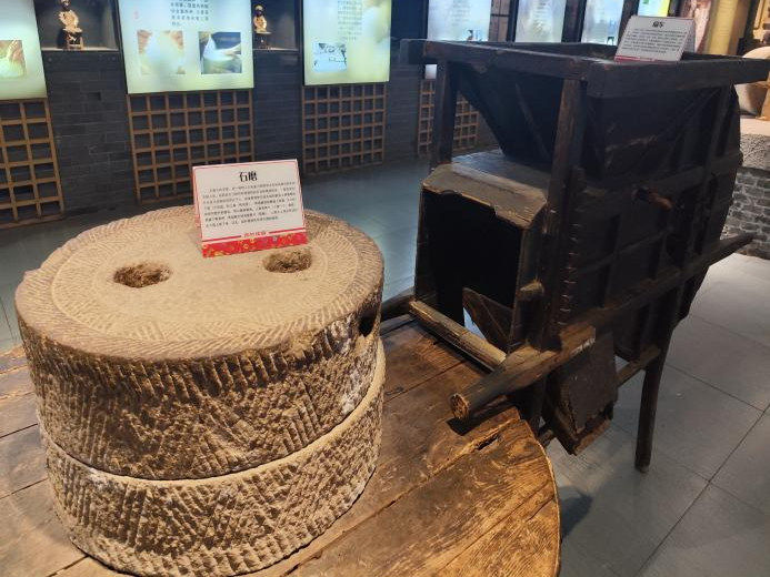 走进周村烧饼博物馆,展厅内详实的图文资料和沙盘模型,清晰地勾勒出烧饼从最初的“胡饼”演变、明中叶“胡饼炉”传入、到清光绪年间聚合斋、大顺号等老字号精研工艺,最终形成“薄、香、酥、脆”独特品质的完整发展脉络。在核心展区,陈列着琳琅满目的传统制饼工具,它们是烧饼技艺传承的无声见证。团队成员被古老的石磨、巨大的和面陶缸、形态各异的木质模具,尤其是那标志性的传统吊炉鏊子所吸引。看着这些浸润着岁月包浆、留下无数匠人手泽的老物件,队员们仿佛能听到历史的回响,感受到一代代制饼人在这方寸之间挥洒的汗水与智慧。