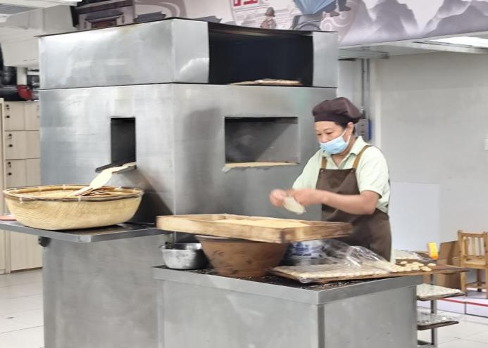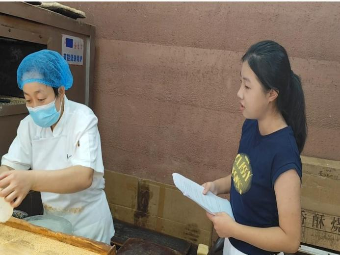 在充分领略了博物馆承载的历史底蕴后,团队成员有幸对坚守在制作一线的周村烧饼工艺制作者杨师傅进行了访谈。在弥漫着麦香与芝麻香的工坊里,杨师傅一边娴熟地展示着延展、着麻、贴饼、烘烤等关键工序,一边向队员们娓娓道来。“周村烧饼看似简单,实则奥妙无穷。从选料、配方、和面、延展成型到高温烘烤,每一步都讲究‘火候’和‘功夫’。‘延展’要薄如纸,均匀透亮;‘着麻’要密而匀;‘贴炉’要快、准、稳;烘烤更是要掌握‘炉火纯青’的技艺,十几秒内就要完美呈现‘薄、香、酥、脆’的特点。”杨师傅朴实的话语中饱含着对传统技艺的无限热爱与敬畏。她特别强调了师徒口传心授、代代相承的重要性,以及在现代工业化冲击下,坚守传统手工技艺的艰辛与价值。