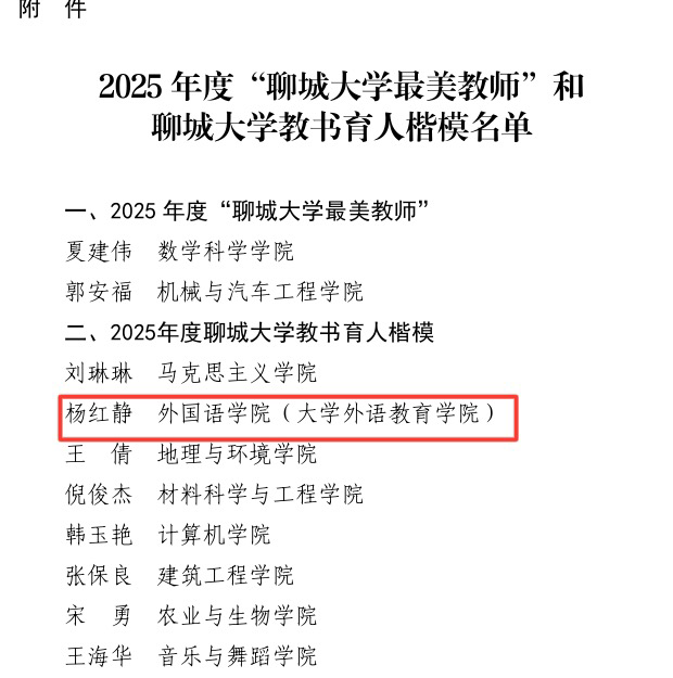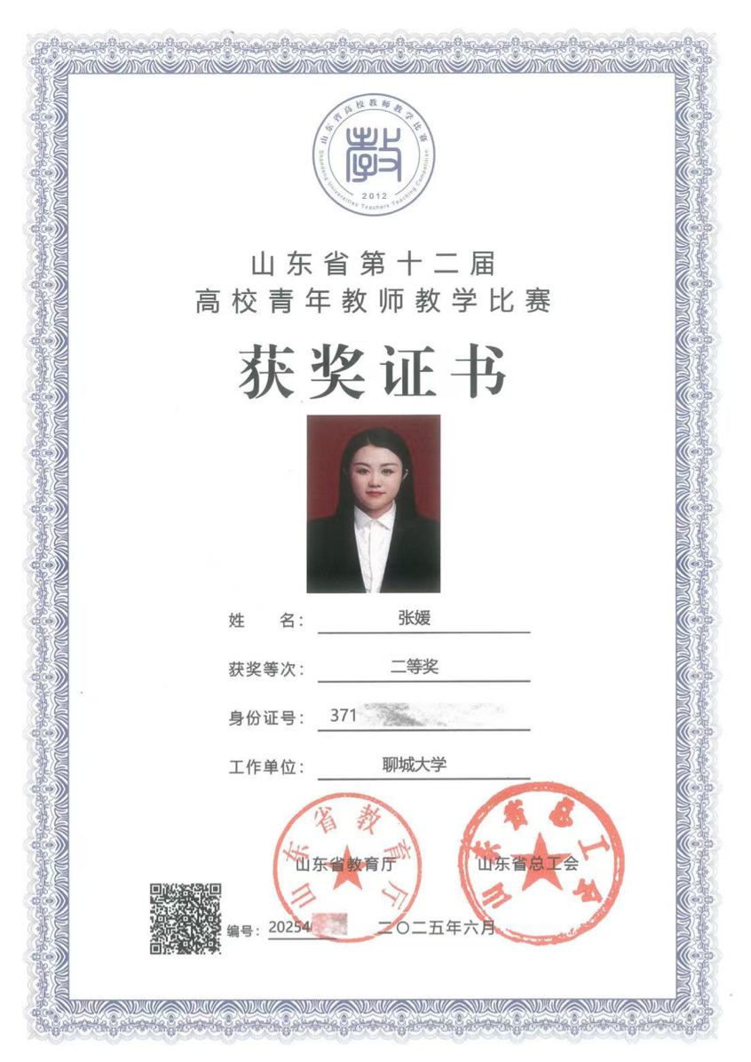 张媛现任英语系副主任,深耕教学领域。她凭借创新教学理念与扎实专业能力斩获佳绩,荣获2025年山东省第十二届高校青年教师教学比赛二等奖,以实力诠释了青年教师的教学担当。