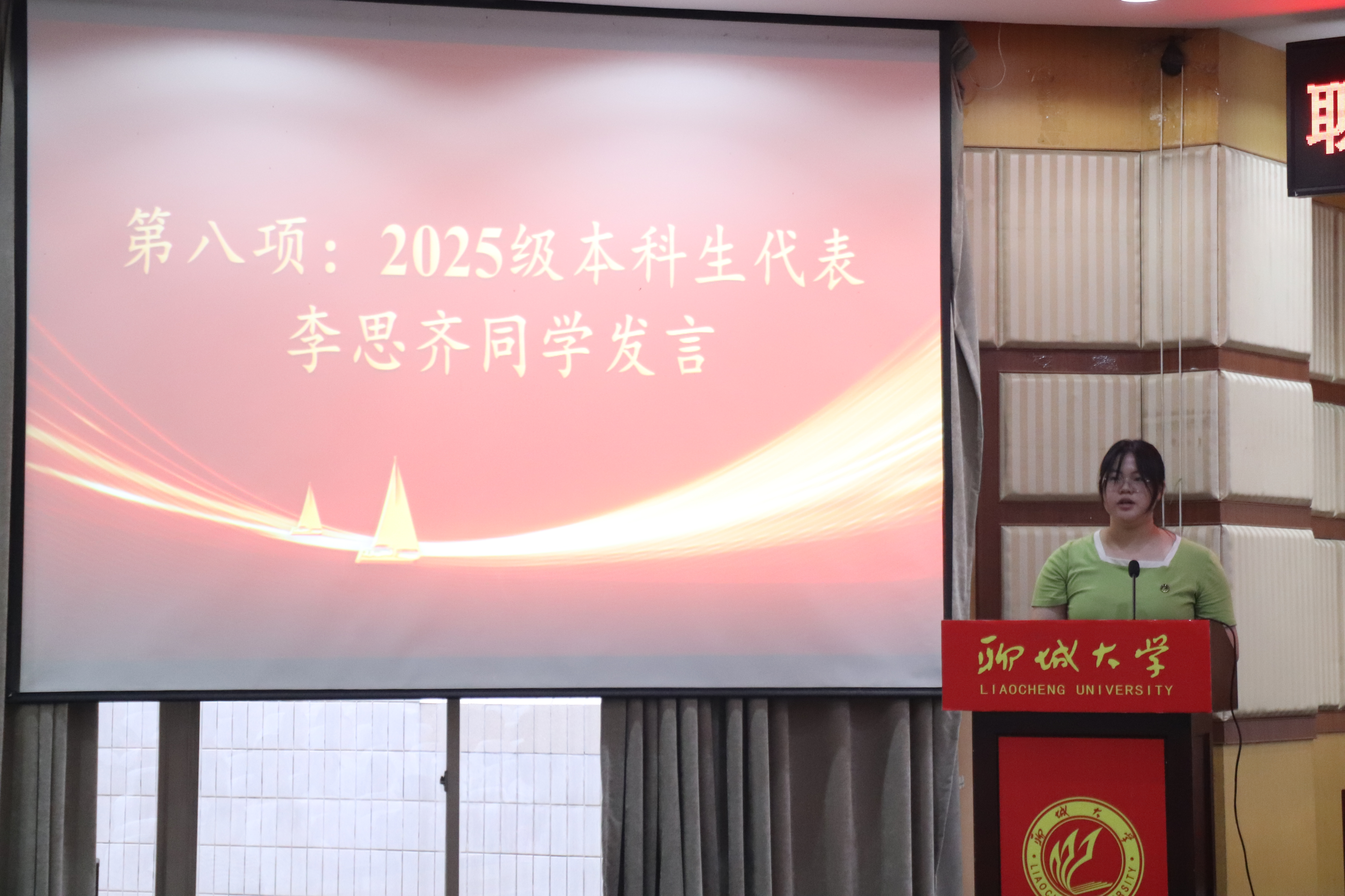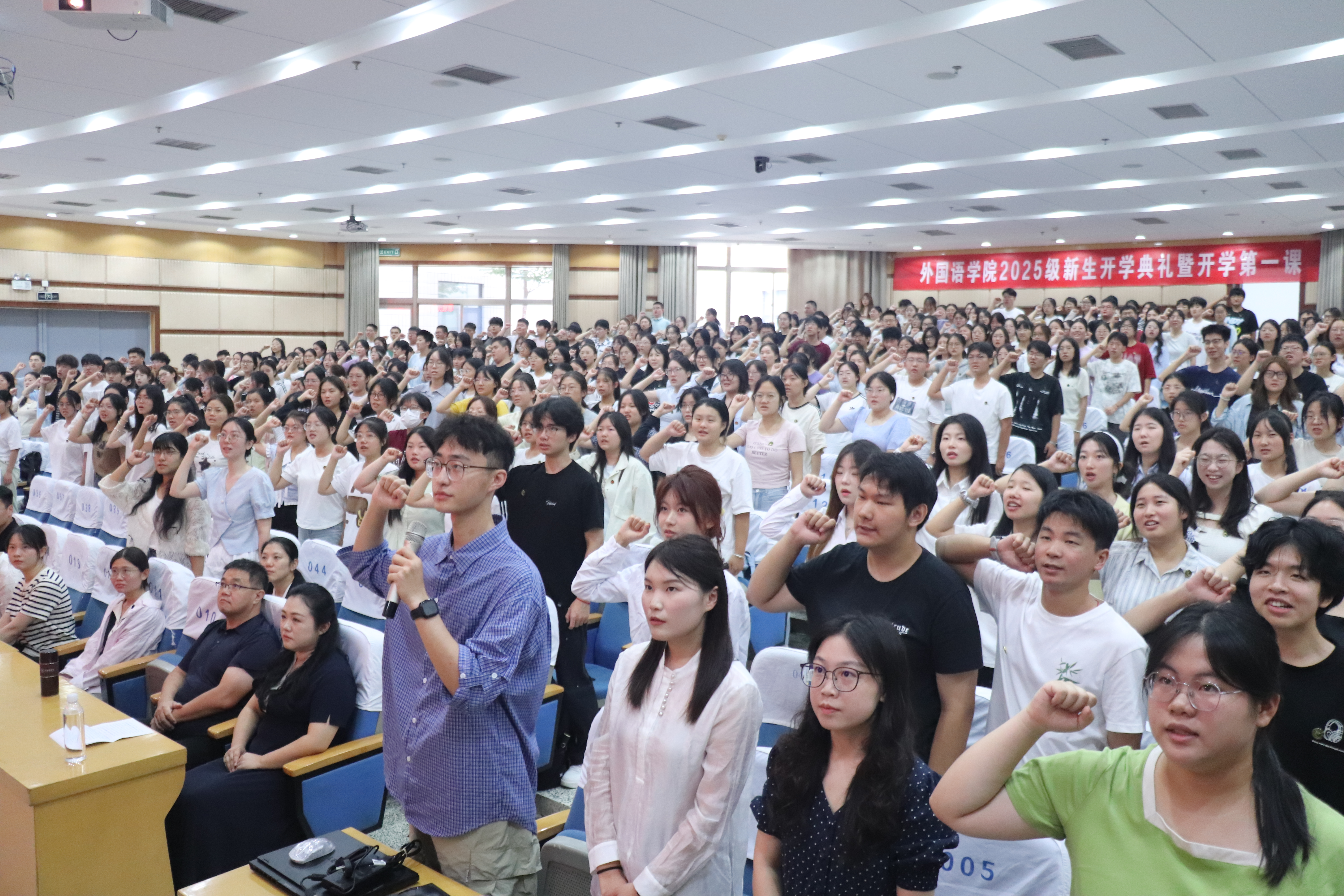 全体2025级新生在领誓人的带领下,挺直身姿、高举右拳,誓言掷地有声,传递出深耕外语专业、求索知识真理的坚定志向。宣誓声落,聊大校歌《飞向美好的明天》悠扬响起,2025级新生齐声合唱,歌声里满是对老员工活的憧憬,更饱含着年轻一代昂扬向上的朝气。