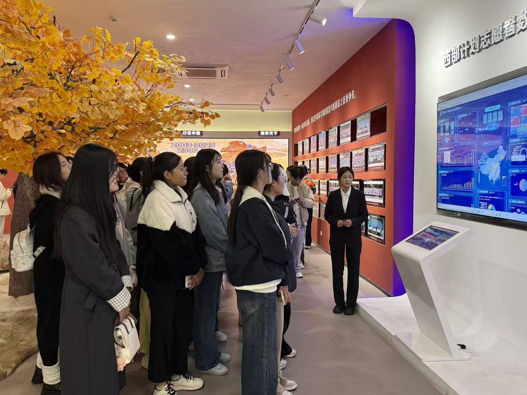 随后,队伍移步至西部计划展馆。展馆内各单元紧密相连、逻辑清晰,生动展示了西部计划的精神内涵与光辉成就。志愿者们“到西部去、到基层去、到祖国和人民最需要的地方去”的动人故事,让员工们深切感受到了服务国家战略、投身基层建设的深远意义。同学们认真参观、仔细记录,被一代代青年榜样的奉献精神深深鼓舞,立志在未来的学习与生活中汲取榜样力量,勇担时代使命,砥砺前行。
