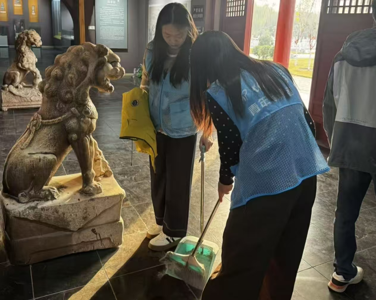 活动伊始,志愿者们迅速分工、默契协作,全身心投入馆内卫生清扫工作。他们特意避开游客集中的区域,轻手轻脚地穿梭在展厅各处,手持工具细致清扫地面浮尘,弯腰捡拾角落、展柜缝隙中的细碎垃圾,用抹布仔细擦拭座椅、展架等公共设施,不放过任何卫生死角,以认真负责的态度维护着馆内洁净整洁的环境。随着时间推移,馆内游客逐渐增多,参观氛围愈发浓厚,志愿者们随即转变工作重心,主动前往展厅入口、通道拐角等关键位置,面带微笑引导游客有序入场、文明观展,耐心提醒众人保持安全距离、不大声喧哗、不触摸展品,遇到游客咨询路线或展品相关问题时,也一一细致回应,全力营造和谐有序的参观氛围。待博物馆举办的社交活动结束后,针对现场参与活动的小朋友们,志愿者们化身贴心守护者,温柔引导孩子们排好队伍,反复叮嘱众人不推挤、不奔跑,紧紧跟随家长的脚步,同时留意每一位小朋友的动向,及时帮扶行动较慢的孩子,细致疏导离场秩序,确保所有孩子都能安全有序地离开。此次活动中,志愿者们在各个环节都展现出强烈的责任心与无私的奉献精神,用实际行动生动诠释了志愿精神的内涵,成为博物馆里一道温暖而亮丽的风景线。