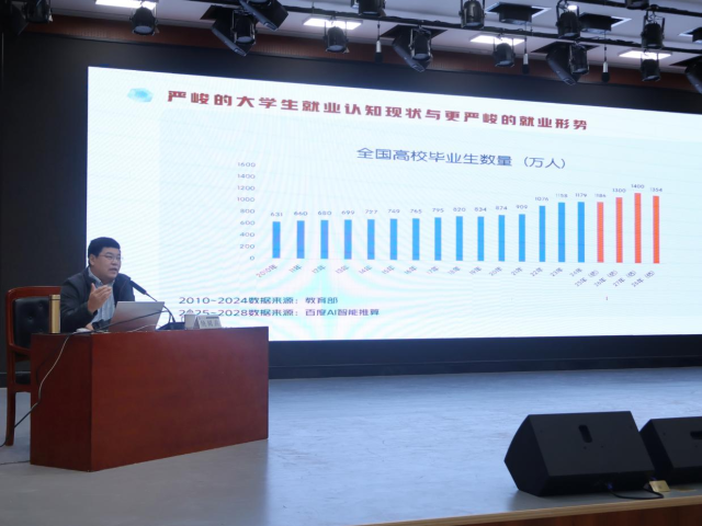 姚圆鑫博士以老员工就业认知现状为切入点,阐述了当前高校毕业生普遍存在的就业问题,解析了严峻的就业形势,分析了自2023年以来的高校员工职业生涯发展及就业情况。他指出,当代高校毕业生就业普遍存在“慢就业”、“缓就业”、“懒就业”和“不就业”的问题,并且,姚圆鑫博士就“学专业干什么?”、“上大学为什么?”、“我的人生是什么?”等议题展开分析。