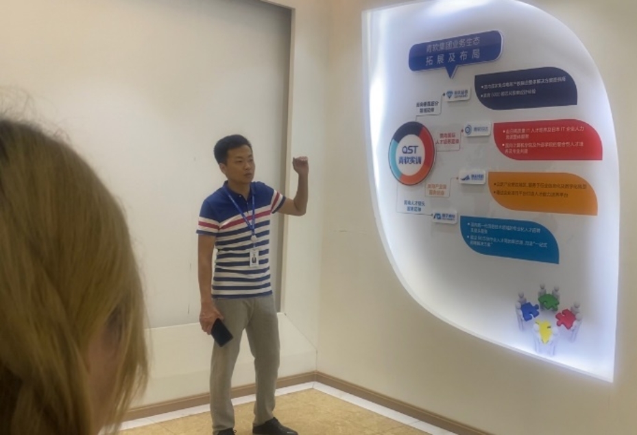 吴海亮老师与青软锐达渠道总监滕大伟带领员工参观青软集团,了解青软的发展历史与创建理念,同时参观了青软青岛基地,帮助同学们更好地认识了青软集团文化、发展史、业务生态体系、产教融合定位和价值、员工就业情况等。滕大伟老师在介绍产教融合中重点阐述“以产业和用人需求、技术发展为导向”的思想,通过对企业和高校的核心定位实施教学培养计划,不断提高人才培养的质量,体现实训教育的价值体系。